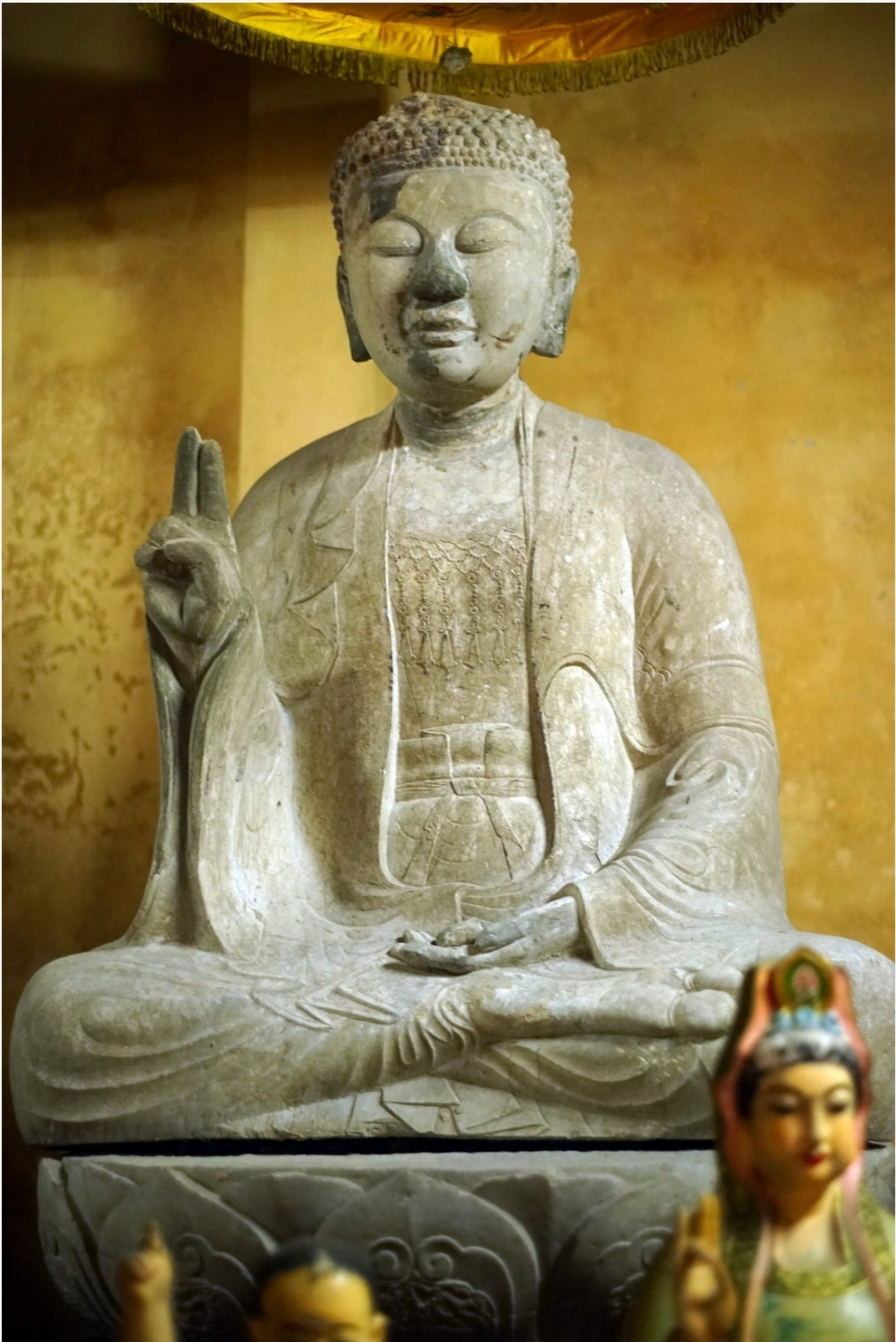 Bức tượng ở giữa được tạc trong tư thế ngồi thiền“bán kiết già” trên toà sen, tay phải giơ lên trong tư thế kết ấn, tay trái để úp nhẹ nhàng trên đùi trái. Tượng vận pháp y với ba lớp mềm mại: Lớp ngoài choàng qua bờ vai, lớp trong phủ kín toàn thân, lớp trong cùng phía trên để hở ngực đeo dây anh lạc.