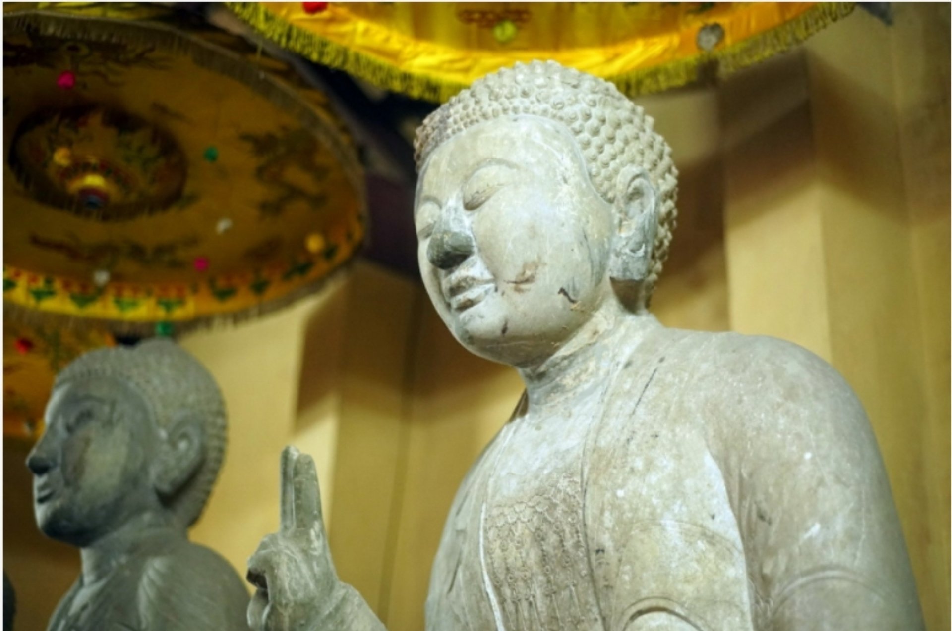 Cả ba pho tượng cơ bản còn nguyên vẹn, riêng pho ở giữa sứt một phần đùi trái.
