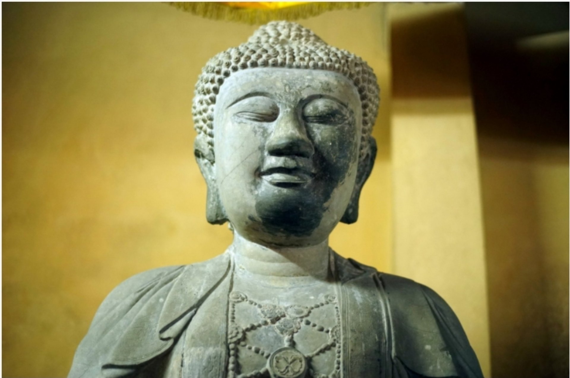 Đầu tượng to, sọ nở, tóc xoắn ốc, đỉnh nổi nhục khấu. Khuôn mặt nữ tính, đầy đặn, phúc hậu, lông mày cong lá liễu, mắt khép hờ nhân từ, miệng mỉm cười độ lượng; tai to dài chảy.